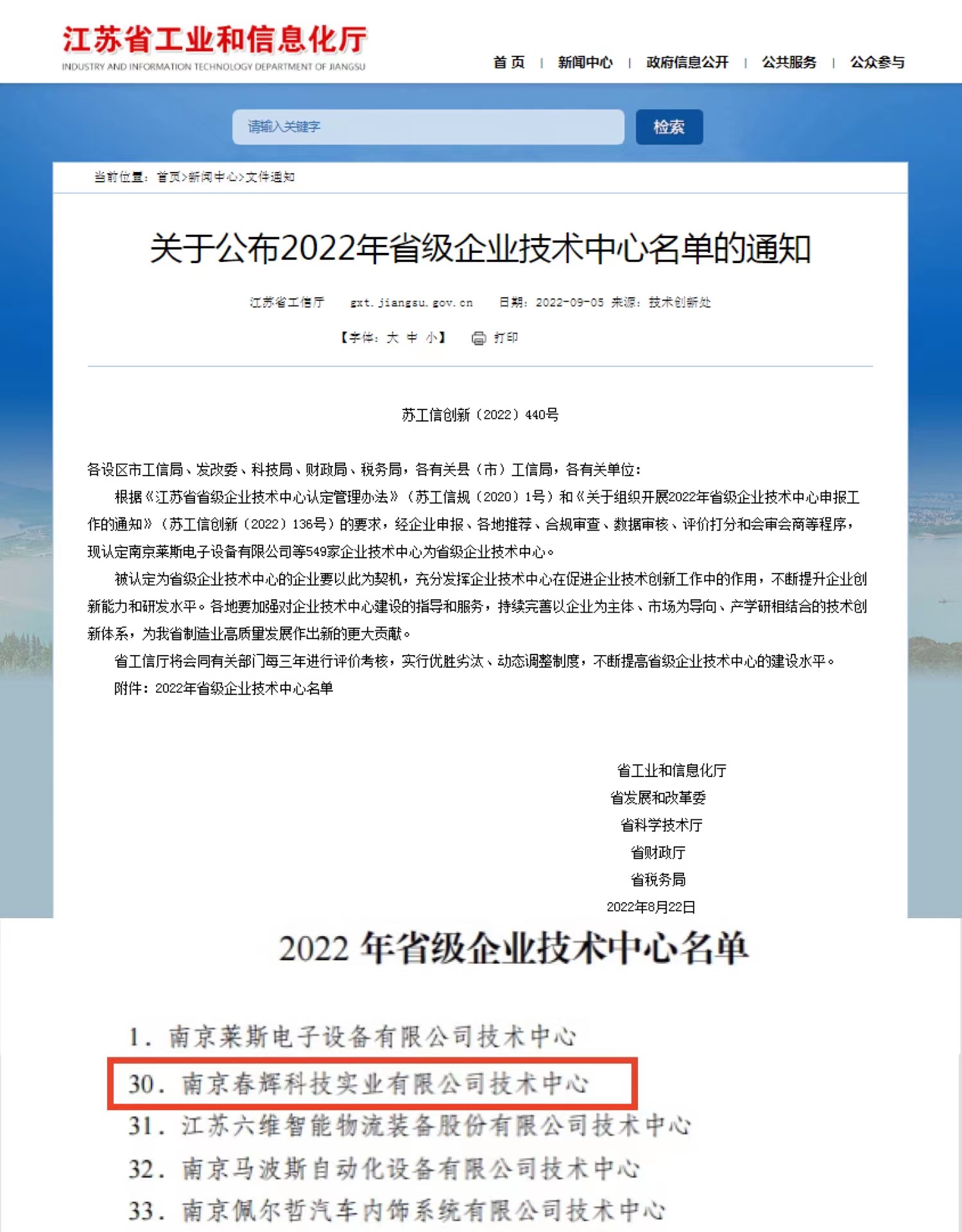 近日,江蘇省工業(yè)和信息化廳公布了2022年江蘇省省級企業(yè)技術(shù)中心認(rèn)定名單,南京春輝科技實業(yè)有限公司榜上有名,被認(rèn)定為江蘇省企業(yè)技術(shù)中心。“省級企業(yè)技術(shù)中心”申請認(rèn)定條件多,審批流程嚴(yán)格,不僅在企業(yè)規(guī)模等經(jīng)濟指標(biāo)上有較高的要求,而且更注重創(chuàng)新能力,是對企業(yè)研發(fā)實力的權(quán)威性認(rèn)可和高度肯定。